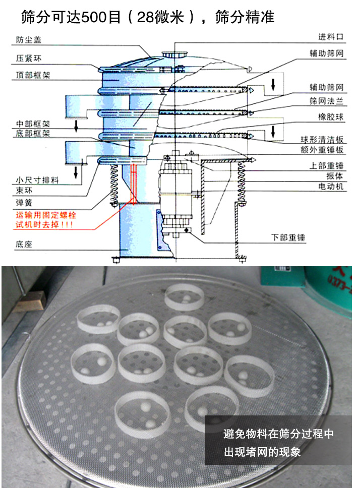 大漢不銹鋼旋振篩篩分可達500目(28微米),篩機內(nèi)部裝配有彈跳球清網(wǎng)裝置,可對篩面進行清潔處理,進一步提高篩分精度。
