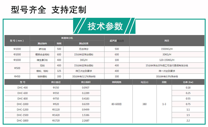 大漢不銹鋼超聲波振動(dòng)篩型號(hào)有DHC-400、DHC-600、DHC-800、DHC-1000、DHC-1200、DHC-1500、DHC-1800等,所有型號(hào)都有生產(chǎn),且都是現(xiàn)貨供應(yīng),如果我們的設(shè)備還不能讓您滿意,大漢廠家還可為您免費(fèi)特殊定制。