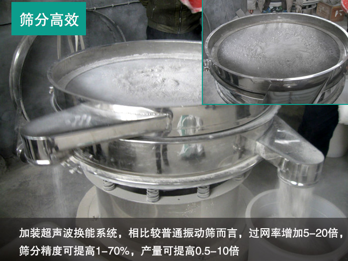 ②我們的微礦粉超聲波振動(dòng)篩由于加上了超聲波篩分系統(tǒng),因此可以加快團(tuán)聚物、高靜電、高精細(xì)、高密度、比重輕、吸附物料的分離,從而增加其篩分量,相比較普通振動(dòng)篩而言,過網(wǎng)率增加5-20倍,篩分精度可提高1-70%,產(chǎn)量可提高0.5-10倍,適合日產(chǎn)1000噸微礦粉的超聲波振動(dòng)篩。
