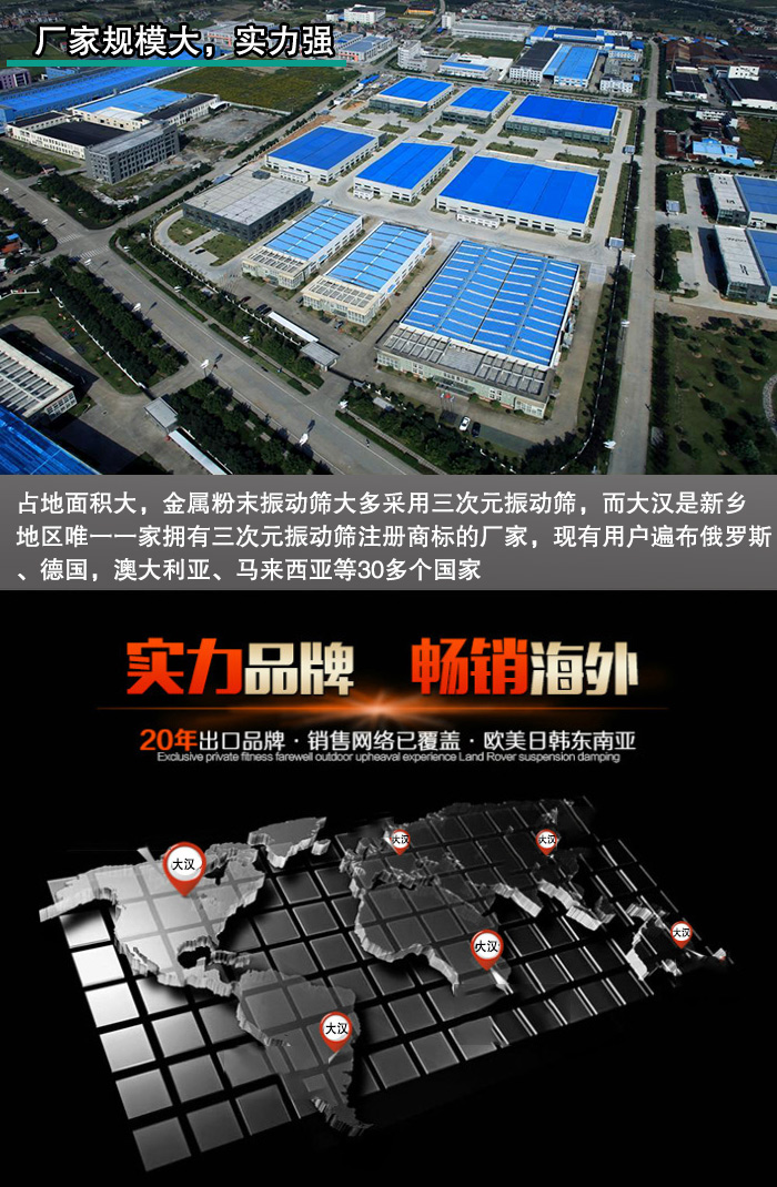 新鄉(xiāng)大漢占地10000平方米,擁有自己獨(dú)立的大型工業(yè)廠房,各種設(shè)備齊全,而且新鄉(xiāng)大漢生產(chǎn)振動(dòng)篩30余年,積累了大量的生產(chǎn)經(jīng)驗(yàn)。金屬粉末振動(dòng)篩大多采用三次元振動(dòng)篩,而大漢是新鄉(xiāng)擁有三次元振動(dòng)篩注冊(cè)商標(biāo)的廠家,專業(yè)性非常強(qiáng),現(xiàn)有用戶遍布俄羅斯、德國(guó),澳大利亞、馬來(lái)西亞等30多個(gè)國(guó)家,用戶口碑好。