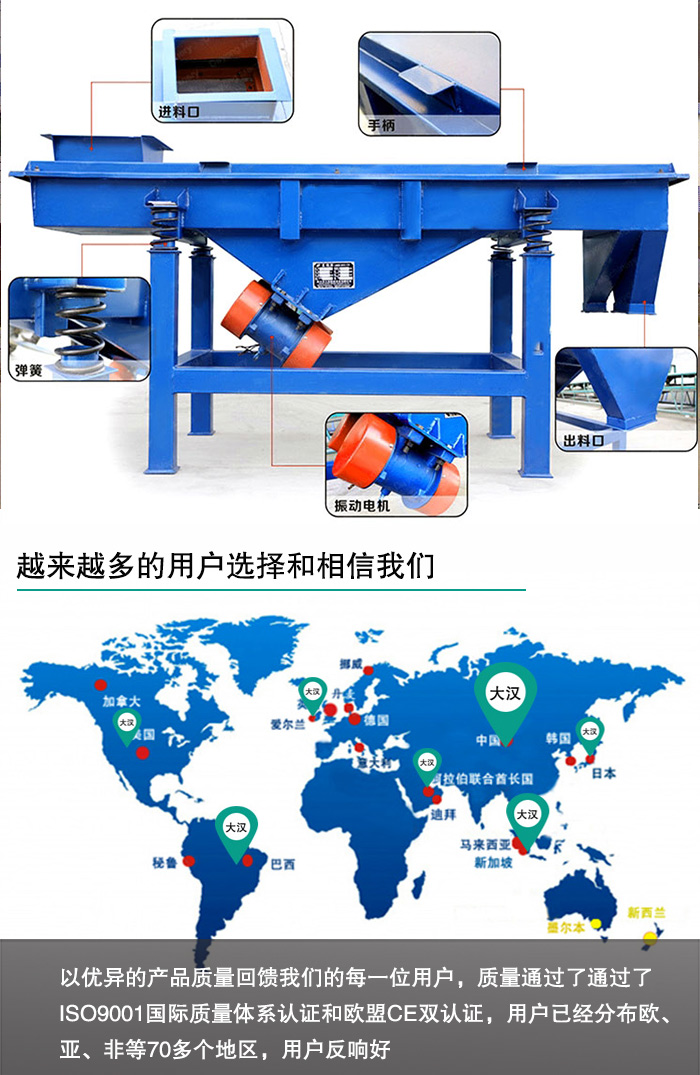 新鄉(xiāng)大漢廠家始終將用戶權(quán)益擺在首位,杜絕一切低劣產(chǎn)品,材質(zhì)優(yōu)中選優(yōu),對每一臺直線振動篩進行嚴格的質(zhì)量管理,大漢直線振動篩通過了ISO9001國際質(zhì)量體系認證和歐盟CE雙認證,堅持以優(yōu)異的產(chǎn)品質(zhì)量回饋我們的每一位用戶,在其研發(fā)能力、制造能力、產(chǎn)品質(zhì)量均處于國內(nèi)和貼近國際水平的情況下,越來越多的用戶選擇和相信我們,從目前來看,新鄉(xiāng)大漢用戶已經(jīng)分布歐、亞、非等70多個地區(qū),用戶反響一致很好。