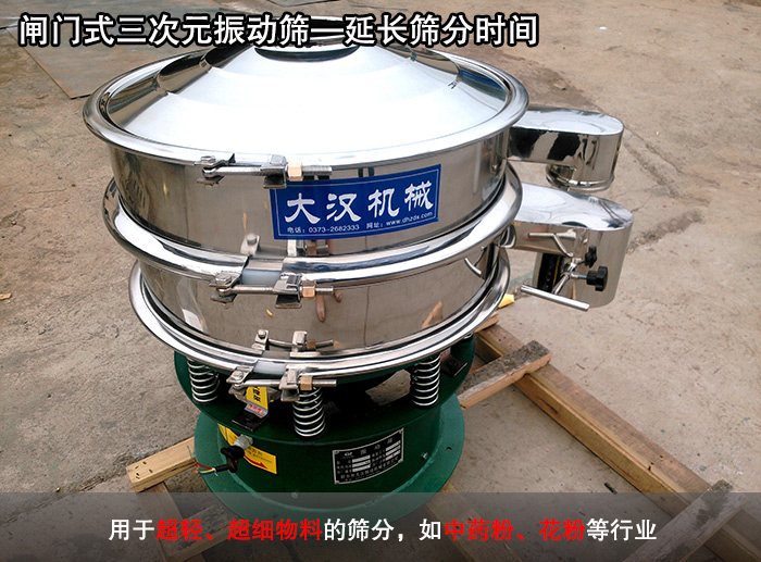 該種類型的三次元振動篩是在實際應(yīng)用中衍生出來的一種產(chǎn)品,是在普通型三次元振動篩出料口處加裝閘門,主要是在篩分物料中的雜質(zhì)時使用,通過關(guān)閉出料口使物料進(jìn)行充分篩分。用戶可以一次投料長久篩分作業(yè),通過控制閘門的開合以達(dá)到良好篩分的目的,這種篩分作業(yè)多用于超輕、超細(xì)物料的篩分,如中藥粉、花粉等行業(yè)。