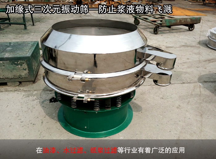 該種類型的三次元振動篩是在普通型旋振篩的基礎(chǔ)上增大它的入料口,并通過特殊角度的設(shè)計以防止液體飛濺的過濾型篩分設(shè)備,在油漆、水過濾、紙漿過濾等行業(yè)有著廣泛的應(yīng)用。該系列旋振篩是我廠在吸收國內(nèi)外先進(jìn)技術(shù)基礎(chǔ)上,設(shè)計出的具有國內(nèi)先進(jìn)水平的特殊性、高粘度、細(xì)粒物料篩分設(shè)備,主要用于篩分細(xì)粉、微粉、以及干、濕物料等。