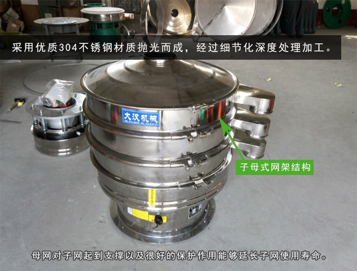 大漢生產(chǎn)的一米不銹鋼振動篩采用優(yōu)質(zhì)304不銹鋼材質(zhì)拋光而成,經(jīng)過細節(jié)化深度處理加工,再加上其采用新式子母式網(wǎng)架結(jié)構(gòu),子網(wǎng)壓在母網(wǎng)上面,對子網(wǎng)起到支撐以及很好的保護作用,有了母網(wǎng)的保護,子網(wǎng)的使用壽命提高了十幾倍,減低了用戶的維修成本。并且子網(wǎng)的換網(wǎng)工作非常方便,有效的節(jié)省了因換篩網(wǎng)而浪費的生產(chǎn)時間。