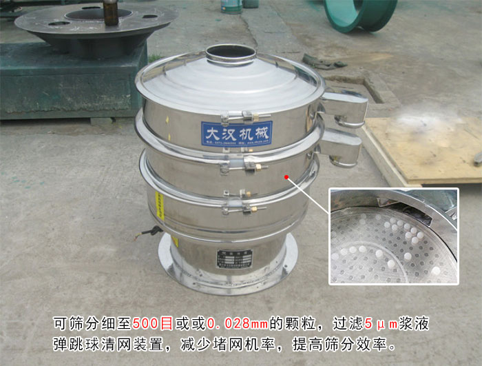 可篩分細至500目或或0.028mm的顆粒,過濾5μm漿液,大漢一米不銹鋼振動篩在篩分精度上成就顯著,另外還專門裝配有彈跳球清網(wǎng)裝置,物料在篩分過程中彈跳球會不停的篩網(wǎng)進行碰撞,減少物料堵網(wǎng)的現(xiàn)象,進一步提高一米不銹鋼振動篩的篩分精度與效率。