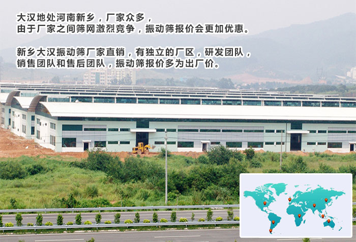 河南新鄉(xiāng)市是生產(chǎn)振動(dòng)篩的基地,被譽(yù)為“振動(dòng)篩之鄉(xiāng)”,就新鄉(xiāng)市而言,生產(chǎn)振動(dòng)篩設(shè)備的廠家大大小小就有上千家,是個(gè)選購振動(dòng)篩的好去處。但是這其中也不乏一些小作坊,所以建議大家在選購振動(dòng)篩設(shè)備時(shí)還是實(shí)地參觀為妙。這里為您推薦我們新鄉(xiāng)大漢振動(dòng)機(jī)械有限公司: