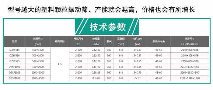 2、型號選擇:各種塑料顆粒振動篩型號多樣,型號越大的塑料顆粒振動篩、產(chǎn)能就會越高,相應(yīng)的價格也會有所增長。