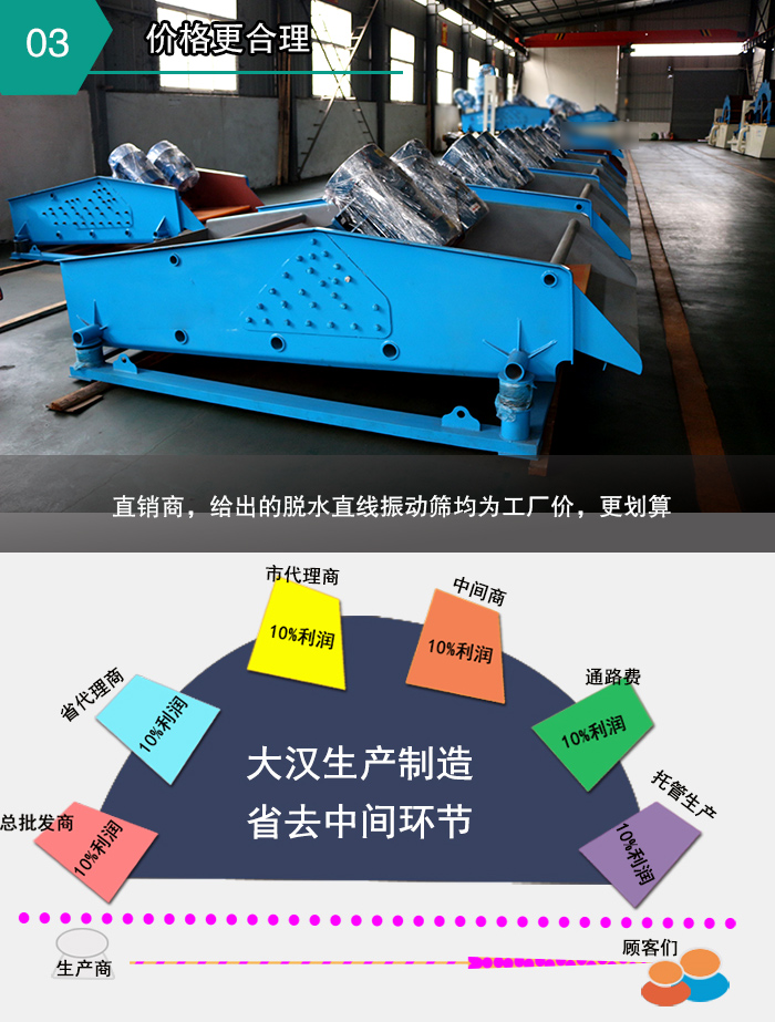 大漢公司是一家直銷商,給出的脫水直線振動篩均為工廠價,無中間商,銷售環(huán)節(jié)少,產(chǎn)生的額外費用低,相對來說,更劃算。