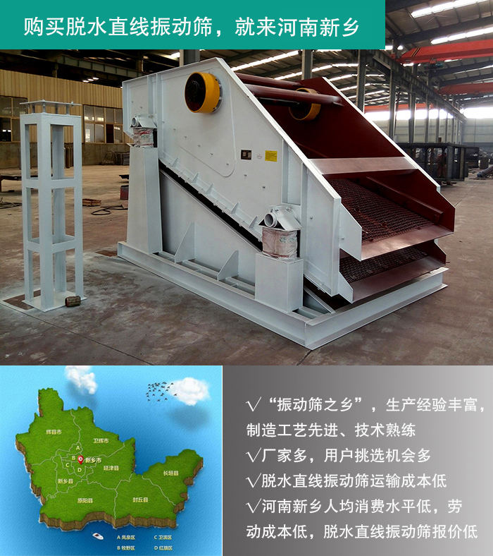 3、河南新鄉(xiāng)地理位置優(yōu)越,鐵路,公路交錯縱橫,脫水直線振動篩運輸成本低,可以減少用戶的部分投資成本。