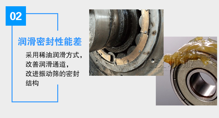 解決方法:采用稀油潤滑方式,改善潤滑通道,改進振動篩的密封結(jié)構(gòu),當(dāng)前不少振動篩廠家采用稀油循環(huán)潤滑,迷宮密封與其他非接觸性密封結(jié)合的結(jié)構(gòu)。