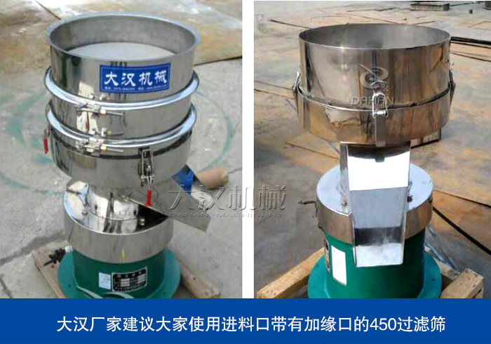 乳膠漆是一種帶有一定粘稠度的漿液,但是在其進行加工過程中,需要使用振動篩對其進行除雜過濾,由于考慮到乳膠漆在篩分過程中可能發(fā)生的漏液、飛濺情況,大漢廠家建議大家使用使用進料口帶有加緣口的450過濾篩進行篩分。