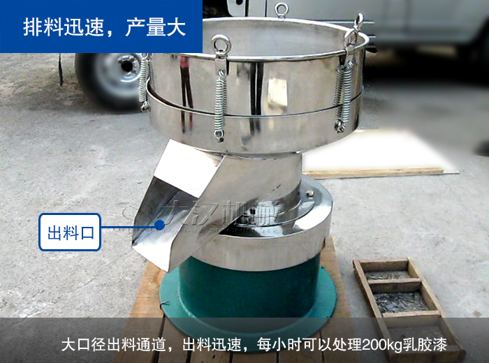 450過濾篩采用大口徑出料通道,出料迅速,每小時可以處理200kg乳膠漆。