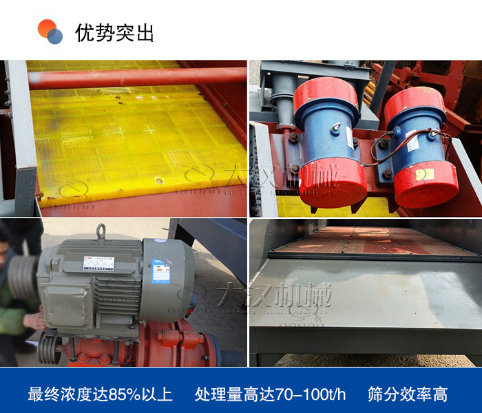 ①濃縮型水力旋流器+高效多頻脫水篩,終濃度達(dá)85%以上,使成品回收率增加,處理量高達(dá)70-100t/h;
