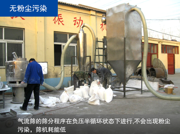 碳化鎢粉在篩分環(huán)節(jié)會出現(xiàn)揚塵現(xiàn)象,對篩分環(huán)境造成影響。氣流篩的篩分程序在負(fù)壓半循環(huán)狀態(tài)下進(jìn)行,可以連續(xù)作業(yè),并且不會出現(xiàn)粉塵污染,篩機(jī)耗能低,更加地能耗低。