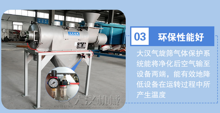 抗氧化劑是一種粉末,所以在篩分途中難免會出現(xiàn)揚塵現(xiàn)象,大漢氣旋篩氣體保護系統(tǒng)能將凈化后空氣輸至設(shè)備兩端,能有效地降低設(shè)備在運轉(zhuǎn)過程中所產(chǎn)生溫度,對軸承形成氣體隔離層,從而杜絕粉塵的進(jìn)入和物料的溢散,再加上其密封嚴(yán)謹(jǐn),所以在篩分抗氧化劑過程中粉塵少。