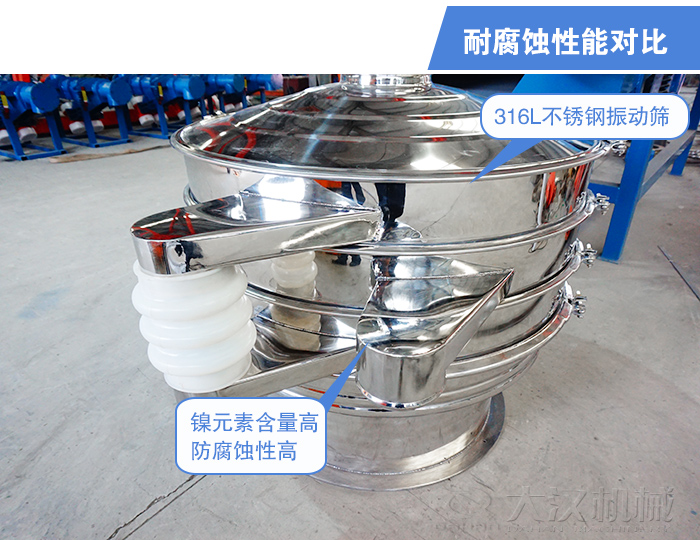 316L不銹鋼振動(dòng)篩降低材質(zhì)中鉻的含量,增加了鎳元素的含量從而防腐蝕性高于304不銹鋼材質(zhì)的振動(dòng)篩。