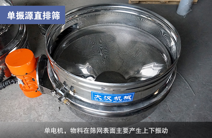 這種類型的直排篩為單電機,物料在篩網表面主要產生上下振動,無自動排料功能。