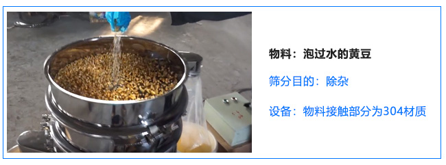 客戶三:要一臺(tái)旋振篩與物料接觸部分要304材質(zhì),用于篩泡過(guò)水的黃豆,除雜用,把黃豆里面的小石子和細(xì)沙過(guò)濾掉