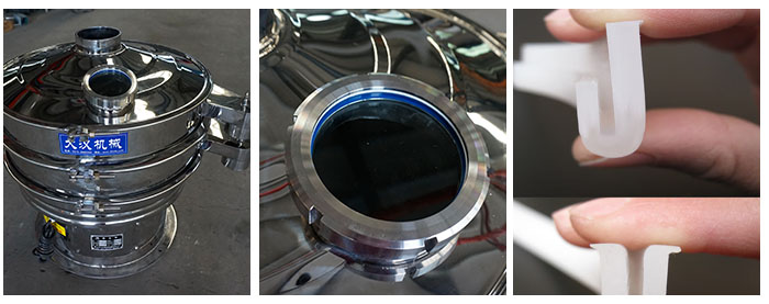 除了不銹鋼振動(dòng)篩在處理中藥粉時(shí),機(jī)體材質(zhì)為醫(yī)藥不銹鋼外,它的密封件和清網(wǎng)彈球等配件,也使用了醫(yī)藥的硅膠材質(zhì),密封性的同時(shí),無死角地保證藥粉篩分的安全衛(wèi)生。
