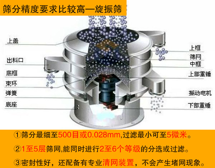 旋振篩作為一種高精度細粉篩分設備,篩分物料范圍廣,篩分細至500目或0.028mm,過濾小可至5微米。分級篩選,可篩1至5層篩網(wǎng),能同時進行2至6個等級的分選或過濾,處理量大。密封性好,還配備有專業(yè)清網(wǎng)裝置,在篩分物料的過程中基本不會產(chǎn)生堵網(wǎng)現(xiàn)象,極大的提高了篩機的篩分產(chǎn)量和篩分效率。