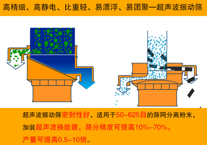 超聲波振動篩是旋振篩的衍生產(chǎn)品,超聲波振動篩是在普通旋振篩的基礎上進行改良,對于旋振篩不能篩分的細粉物料,超聲波振動篩利用超聲波換能器使篩網(wǎng)表面的高鋁細粉始終保持懸浮狀態(tài),從而抑制粘附、摩擦、平降等堵網(wǎng)因素,解決了強吸附性、易團聚、高靜電、高密度、輕比重等篩分難題。超聲波振動篩密封性好,適用于50-625目的篩網(wǎng)分離粉末,篩分精度可提高10%-70%,產(chǎn)量可提高0.5-10倍。