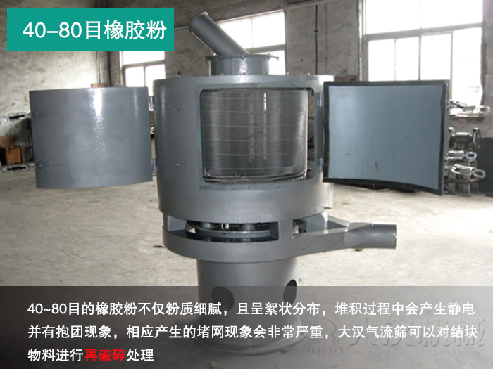 40~80目的橡膠粉不僅粉質(zhì)細(xì)膩,且呈絮狀分布,堆積過(guò)程中會(huì)產(chǎn)生靜電并有抱團(tuán)現(xiàn)象,相應(yīng)產(chǎn)生的堵網(wǎng)現(xiàn)象會(huì)非常嚴(yán)重,不僅會(huì)嚴(yán)重影響篩分效率,還會(huì)產(chǎn)生混級(jí)現(xiàn)象和加速篩網(wǎng)磨損,因此我們建議使用氣流篩作為橡膠粉振動(dòng)篩進(jìn)行篩分。