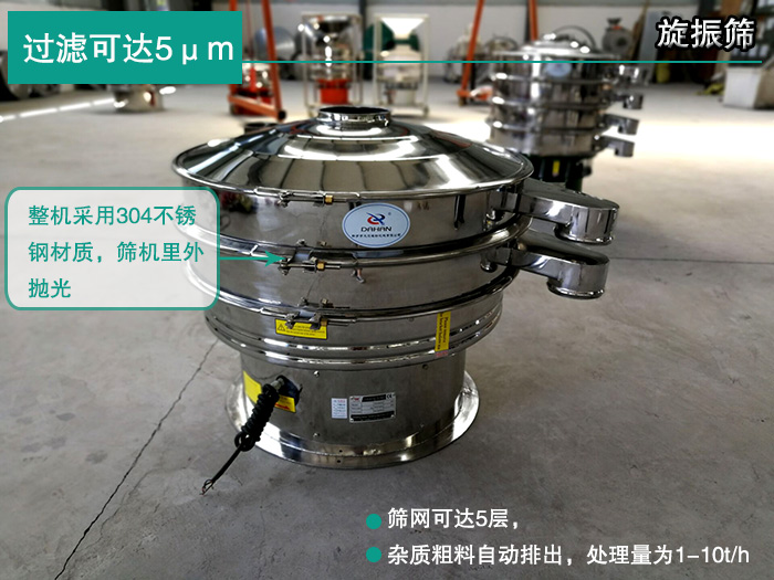 旋振篩整機(jī)采用304不銹鋼材質(zhì),篩機(jī)里外拋光,干凈衛(wèi)生,更適合醫(yī)藥、食品等對(duì)衛(wèi)生條件有高要求的行業(yè)使用,可篩至500目,過(guò)濾可達(dá)5μm,采用"強(qiáng)力"新型動(dòng)力激振器,三維動(dòng)力更加突出,適用范圍更加廣泛,篩網(wǎng)可達(dá)5層,雜質(zhì)粗料自動(dòng)排出,可以連續(xù)作業(yè),處理量為1-10t/h。