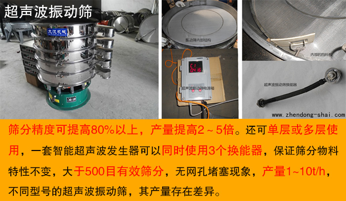 粉體狀粘性物料屬于難篩物料,超聲波振動篩是在普通旋振篩的基礎(chǔ)上加裝了一套超聲波裝置,大的特點(diǎn)就是使用了超聲振動波,能夠篩分旋振篩不能篩分的細(xì)粉物料,對于強(qiáng)吸附性的粘性物料,超聲波振動篩利用超聲波換能器便能夠解決。