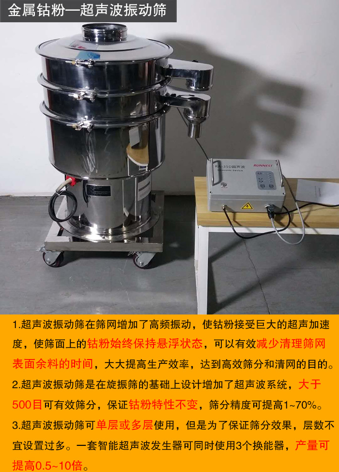 √高精度:在旋振篩的基礎上設計增加了超聲波系統(tǒng),能夠高效的解決輕比重、高密度、強吸附性、易團聚、高靜電及高精度物料的篩分難題,大于500目可有效篩分,保證鈷粉特性不變,篩分精度可提高1~70%。