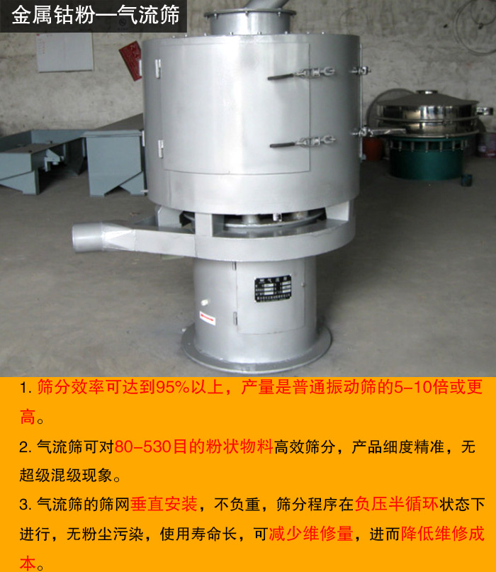 氣流篩篩網為圓筒狀,置于機體內,作業(yè)時鈷粉不是直接投放到篩體內,而是經由一截螺旋輸送機送入,篩箱內的分流葉片高速連續(xù)轉動,將送入的鈷粉吹起沖向圓筒狀的篩網,細料透過篩網進入成品儲料室,粗料從出料口流出。