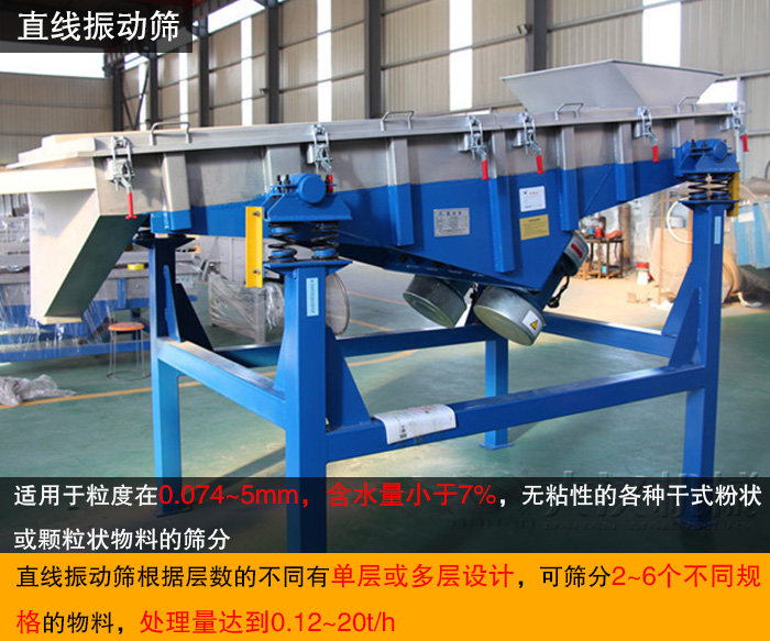 直線振動(dòng)篩利用兩臺(tái)振動(dòng)電機(jī)反向旋轉(zhuǎn),使激振器產(chǎn)生反向激振力,并帶動(dòng)篩箱做前后直線運(yùn)動(dòng),當(dāng)物料從一端的進(jìn)料口進(jìn)入篩箱,均勻分布在篩面上,在激振力和物料自重的合力作用下,物料在篩面上被拋起,向出料口跳躍式前進(jìn),后通過各層孔徑大小不一的篩網(wǎng)實(shí)現(xiàn)對物料的篩分、分級,物料由每層對應(yīng)的出料口排出,從而完成整個(gè)篩分過程,適用于粒度在0.074~5mm,含水量小于7%,無粘性的各種干式粉狀或顆粒狀物料的篩分,大給料粒度不大于10mm,處理量達(dá)到0.12~20t/h,不同型號的直線振動(dòng)篩產(chǎn)量是不同的,用戶需根據(jù)實(shí)際產(chǎn)量需求進(jìn)行合理選擇。