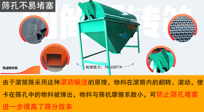 滾筒篩是若干個圓環(huán)狀網(wǎng)組成,其總篩分面積遠遠大于其它篩型的篩分面積,因此其篩分有效面積就大,使物料能充分接觸篩網(wǎng),所以單位時間內(nèi)篩分量就比較大。又因為滾筒篩結(jié)構(gòu)簡單,布置方便,技術(shù)新穎而成熟等特點,極易大型化。
