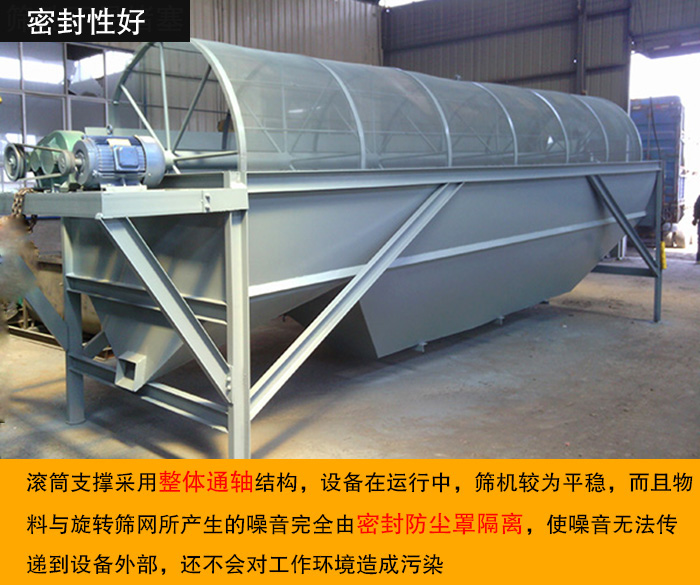 滾筒支撐采用整體通軸結(jié)構(gòu),設(shè)備在運行中,篩機較為平穩(wěn),而且物料與旋轉(zhuǎn)篩網(wǎng)所產(chǎn)生的噪音完全由密封防塵罩隔離,使噪音無法傳遞到設(shè)備外部,還不會對工作環(huán)境造成污染。