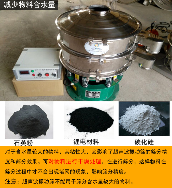 對于含水量較大的物料,其粘性大,會影響了超聲波振動篩的篩分精度和篩分效果。如果要想取得較好的篩分效果,可對物料進行干燥處理,在進行篩分,這樣物料在篩分過程中才不會出現(xiàn)堵網(wǎng)的現(xiàn)象,影響篩分精度。這里我們需要提醒的是,超聲波振動篩不能用于篩分含水量較大的物料。