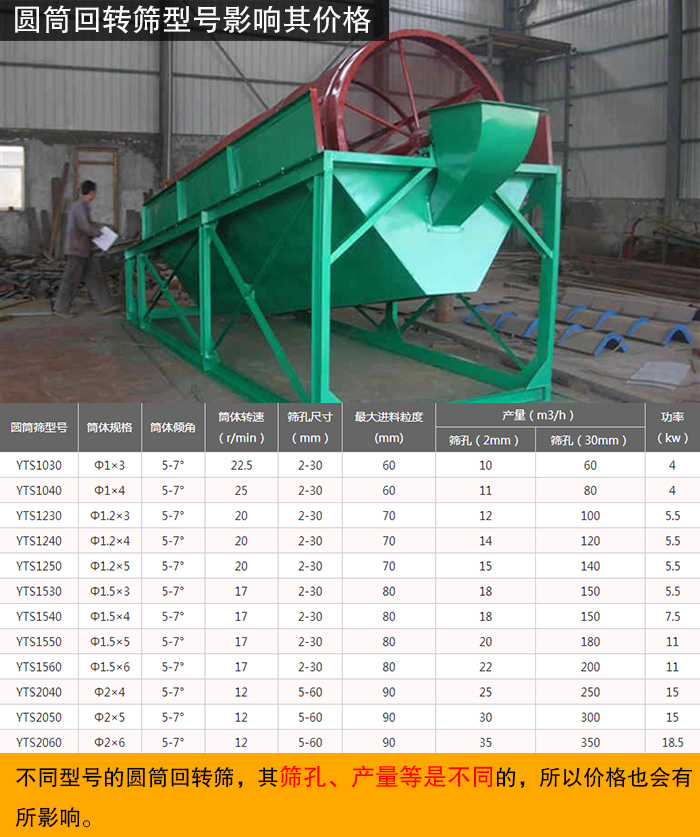 不同型號的圓筒回轉(zhuǎn)篩,其篩孔、產(chǎn)量是不同的,所以價(jià)格也會有所影響。圓筒回轉(zhuǎn)篩型號從YTS1030-YTS2060,其產(chǎn)量必然也是隨之增加的。圓筒回轉(zhuǎn)篩設(shè)備型號越大,產(chǎn)量就越高,其價(jià)格就會越高。(附參數(shù)表)
