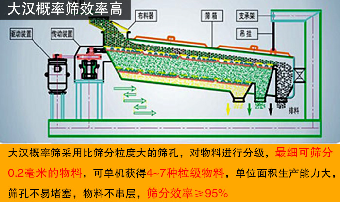 判定產(chǎn)品質(zhì)量的好壞,性能就是一項(xiàng)重要的指標(biāo)。新鄉(xiāng)大漢廠家在產(chǎn)品性能上也絲毫沒有松懈,其生產(chǎn)的概率篩采用比篩分粒度大的篩孔,對(duì)物料進(jìn)行分級(jí),細(xì)可篩分0.2毫米的物料,可單機(jī)獲得4~7種粒級(jí)物料,單位面積生產(chǎn)能力大,篩孔不易堵塞,物料不串層,篩分效率≥95%。