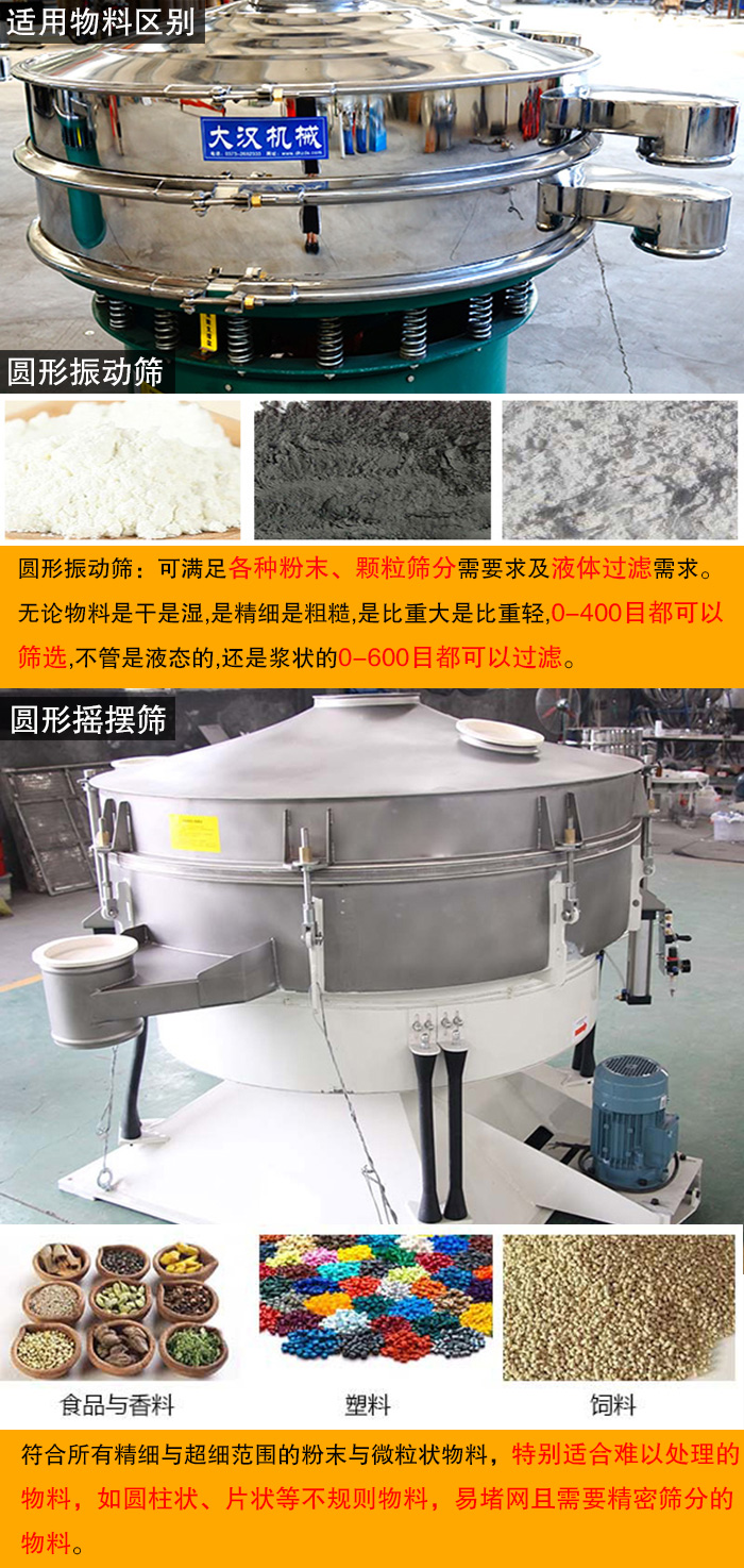 圓形振動篩的應(yīng)用很廣泛的,可滿足各種粉末、顆粒篩分需要求及液體過濾需求。無論物料是干是濕,是精細(xì)是粗糙,是比重大是比重輕,0-400目都可以篩選,不管是液態(tài)的,還是漿狀的0-600目都可以過濾。但是對于不規(guī)則形狀的物料和有靜電、易堵網(wǎng)的物料篩分效果不是很理想。