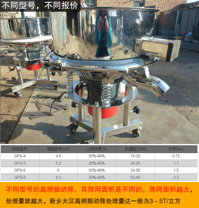 大漢高頻振動篩型號有GTS-4、GTS-5、GTS-6、GTS-8,不同型號的高頻振動篩,其篩網(wǎng)面積是不同的,篩網(wǎng)面積越大,處理量就越大,新鄉(xiāng)大漢高頻振動篩處理量達一般為3~5T/立方,高頻振動篩處理量是和其篩網(wǎng)面積有關(guān),篩網(wǎng)面積又是由其型號決定,所以,型號不同的高頻振動篩價格就有差異。