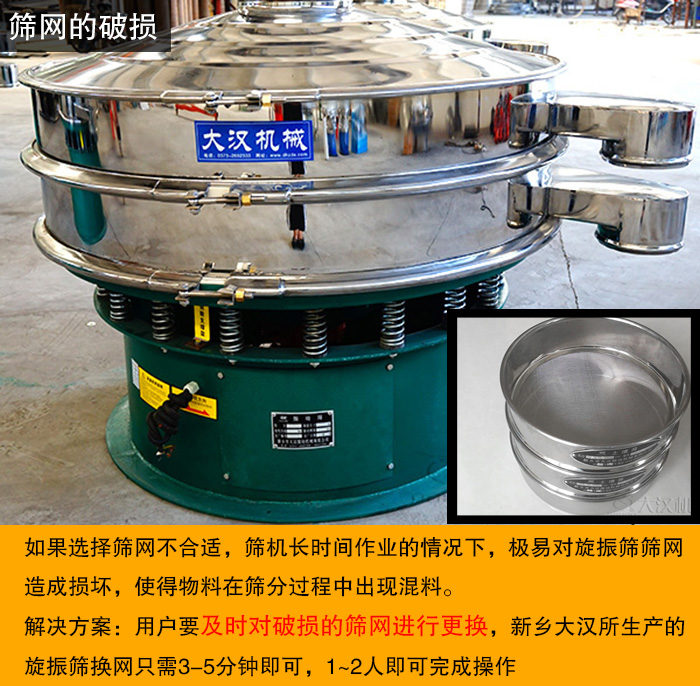 篩網(wǎng)作為直接與物料接觸的部件,主要是對物料進行分級除雜,然而由于旋振篩用戶篩分物料的不同,對其篩網(wǎng)的規(guī)格及選材也是不同的,所以如果選擇篩網(wǎng)不合適,篩機長時間作業(yè)的情況下,極易對旋振篩篩網(wǎng)造成損壞,使得物料在篩分過程中出現(xiàn)混料。所以用戶要及時對破損的篩網(wǎng)進行更換,新鄉(xiāng)大漢所生產(chǎn)的旋振篩換網(wǎng)只需3-5分鐘即可,1~2人即可完成操作。