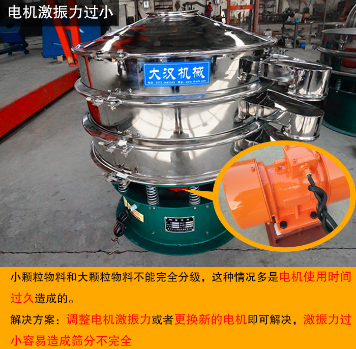 小顆粒物料和大顆粒物料不能完全分級,這種情況多是電機使用時間過久造成的,可以調(diào)整電機激振力或者更換新的電機即可解決,激振力過小容易造成篩分不完全。