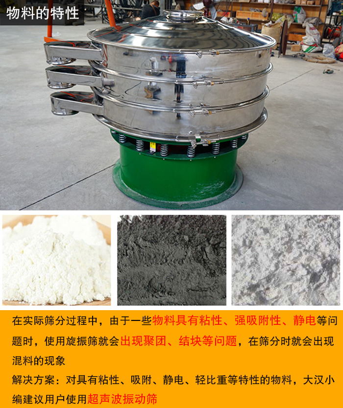 在實際篩分過程中,由于一些物料具有粘性、強吸附性、靜電等問題時,使用旋振篩就會出現(xiàn)聚團、結(jié)塊等問題,在篩分時就會出現(xiàn)混料的現(xiàn)象,所以對具有粘性、吸附、靜電、輕比重等特性的物料,大漢小編建議用戶使用超聲波振動篩。